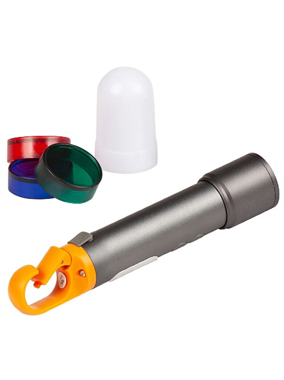 Con indicador de carga LED y carga USB-C. Incluye mosquetón para colgarla, led COB lateral, filtros de color RGB, y filtro blanco para hacerlo omnidireccional.