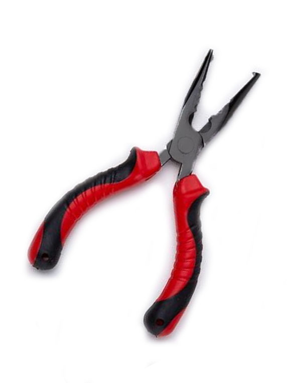 Pinza con mango anatómico de corte y presión, punta para abrir anillas y cambiar anzuelos triples.